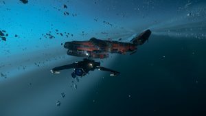 Für einen Moment steht im Raum, ob es vielleicht klüger ist, sich zurückzuziehen und Verstärkung anzufordern, dann aber nehmen wir den Kampf auf. Ich rotiere im Steuerbord-Turret-Geschütz, nehme alles aufs Korn, was mir vor die Flinte kommt. Die anderen manchen es genauso. Husky fliegt unterdessen selbst mit der trägen „Frost“ seine berüchtigten Manöver. So gelingt es uns tatsächlich, Gegner um Gegner auszuschalten – darunter eine Superhornet, eine Vanguard und sogar eine Mercury Starrunner. Das Überraschungsmoment liegt auf unserer Seite – wahrscheinlich haben sie nicht damit gerechnet, dass ein einzelnes Schiff so verrückt sein würde, es mit einer ganzen Armada Piraten aufzunehmen.