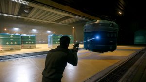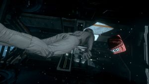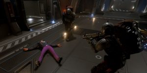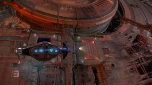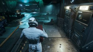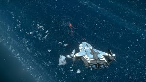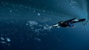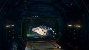 Zurück auf der Station untersuchen wir das Schiff auf Schäden – die gepanzerte Hülle der „Frost“ hat die meisten Laserschüsse jedoch absorbiert. An manchen Stellen sind ein paar Schmauchspuren zu sehen, aber sonst sieht das Schiff top aus. Wir laufen es zu viert auf der Oberseite ab.