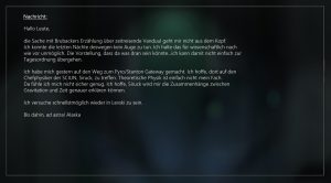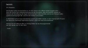 Ich hänge meinen Gedanken nach – sind das wirklich die richtigen Schritte, die wir unternehmen? Tatsache ist: Auf Levski selbst kommen wir nicht mehr weiter, wie müssen den Kreis größer ziehen, vielleicht noch mehr als bisher das Unwahrscheinliche als wahrscheinlich annehmen. Und Tatsache ist auch: Nyx ist ein entscheidender Spielball in dieser intergalaktischen Verschwörung und geht in diesem Chaos garantiert vor die Hunde, wenn nicht bald die Wahrheit auf den Tisch kommt.