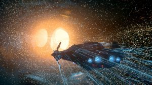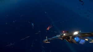 Husky steuert das Schiff, wir anderen besetzen unterdessen die Kanonen. Kaum haben wir den Quantumflug bei unserem ersten Patrouillengebiet verlassen, schießen wir uns in sicherer Entfernung zum Ziel ein wenig ein. Ich drehe mich im Steuerbord-Turret wild um alle Achsen, es ist wie auf einer verrückten Achterbahn, dabei hält Husky das Schiff noch ruhig. Keine Ahnung, wie das wird, wenn er wilde Manöver fliegt.
