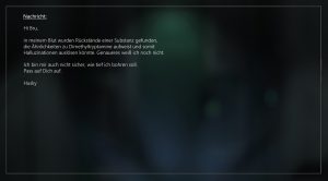Am nächsten Morgen lese ich in Zeros Journal, dass er sich aktuell auf Orison als Putzhilfe verdingt, während wir gefeiert haben. Wieder irgendeine Hyper-Geheime-Inkognito-Sache. Gut, dann kann er ja mal gleich unsere ganzen Bierflaschen beseitigen. Hab‘ auch schon einen neuen Namen für ihn: Kehro.