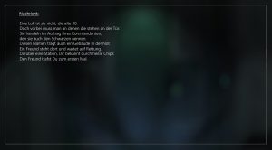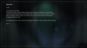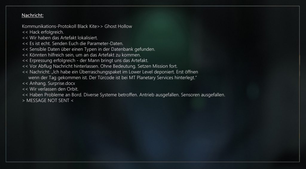 Wie erreichen unterdessen Daymar und Gabriel bringt uns runter zum Wolf Aid Shelter, in dem Zero sitzen soll. Vor der kleinen Station im Nirgendwo steht eine kleine Cutter – Zeros Schiff? Während Gabriel das Schiff in Startkonfiguration hält, falls es sich um einen Hinterhalt handelt, checken Ella und ich die Lage.