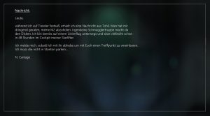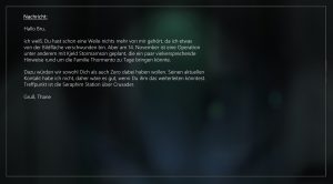 Alles schneide ich nicht mit – wie es scheint, reicht die Zeit aber noch und Gabriel überspielt Darneely die Daten. Erschossen wird auch keiner. Es läuft besser als gedacht. Nachdem Gabriel zurückgehumpelt ist, hauen wir wieder so schnell ab, wie es geht, dann entschlüsselt er die Daten und sieht, seit wann Zero im Klescher-Knast ist.