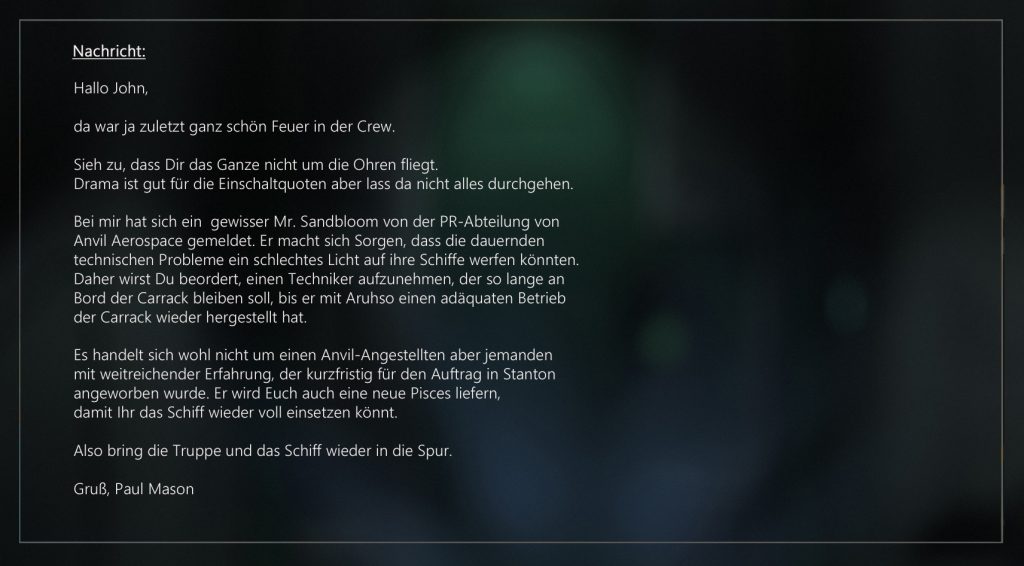 Als uns Mr. Aruhso diese Nachricht an Bord der Carrack verklickert, sind wir alle mehr oder weniger geschockt. Erst schicken sie uns einen Babysitter mit an Bord, nun legen sie uns auch noch an die Kette! In mir steigt kalte Wut auf und ich überlege für einen Moment, das ganze Projekt hinzuwerfen.