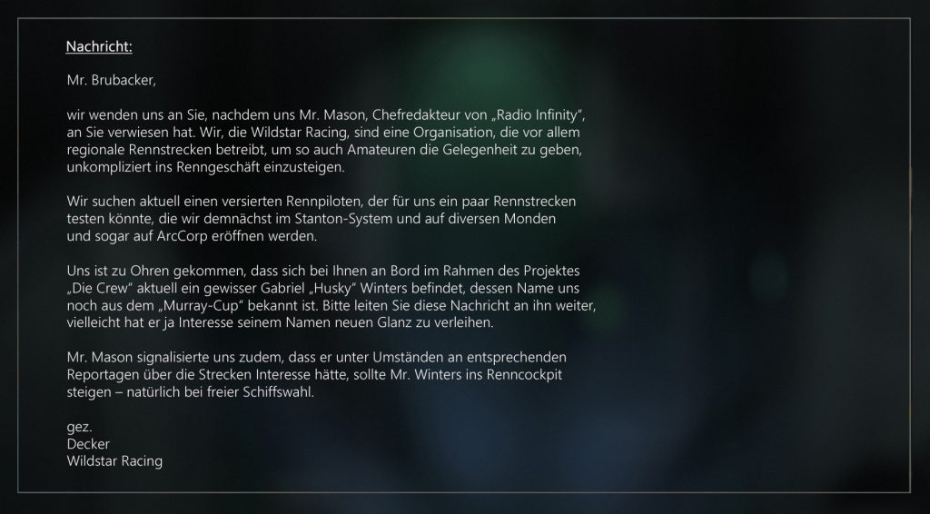 War es klug, sich auf Anvils Angebot einzulassen, eine Carrack für „Radio Infinity“ zu fliegen und eine kleine Radioshow zu produzieren? Was hat es mit einem geheimnisvollen Artefakt an Bord auf sich? Tatsache ist: „Die Crew“ fordert Brubacker auf vielfältige Weise. Er hofft in diesem Jahr viele offene Fragen zu klären und macht Schritte in ein vielfach größeres Universum – natürlich wie immer nicht ohne Schwierigkeiten…