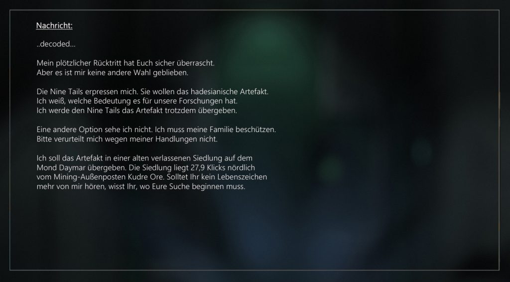 Gabriel weiß mehr – offenbar hat Ray Keaton, der ja immer noch hinter Zero wegen der Renaissance-Geschichte her ist und der mich geschlagen hatte, aus einem Com-Array eine Funkübertragung abgefangen, in der Hurstons Gefangenentransporte der letzten Zeit kodiert waren. Diese Daten hat Ray auch Husky gegeben – zur Dekodierung. Zwei Krypto-Keys hat Gabriel daran bereits verschlissen, dann hatte er wohl eine rettende Idee: Eine Platine, die in der Lage ist, die verschlüsselten Daten zu lesen, ist auf einem abgestürzten Satelliten zu finden – wo genau, weiß wiederum ein gewisser Clovus Darneely, der auf Hurston die örtliche Schrotthalde betreibt.