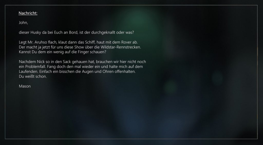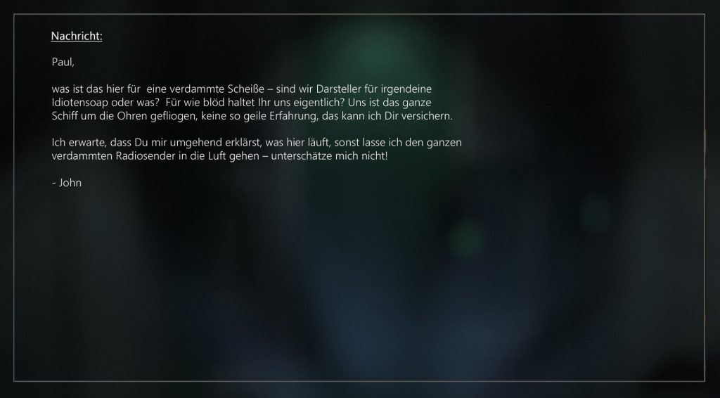Plötzlich hören wir eine Durchsage – auf Port Tressler, wo wir zuvor gestartet waren, hat es ein Gasleck gegeben. Wir checken uns auf Huskys „Frost“ durch – alles nur eine Halluzination, ausgelöst durch eine Vergiftung?