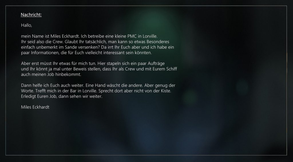 Es geht vorbei an zerrissenen Raumschiffen, metall-kreischenden Sägen und Altmetall, dann erreichen wir Clovus Darneely, einen alten, wie es scheint, zutiefst zynischen, vor sich hin hustenden Mann. Er mustert uns misstrauisch, dann rückt er die Koordinaten auf Hurston raus, an denen wir die Platine finden werden. Haben wir ihm dann ebenfalls ein paar Daten übertragen, an denen er gesteigertes Interesse hat, so wird er alle Funktionen der Platine frei schalten. Wir dürfen sie behalten und damit machen, was wir wollen. So weit, so gut.