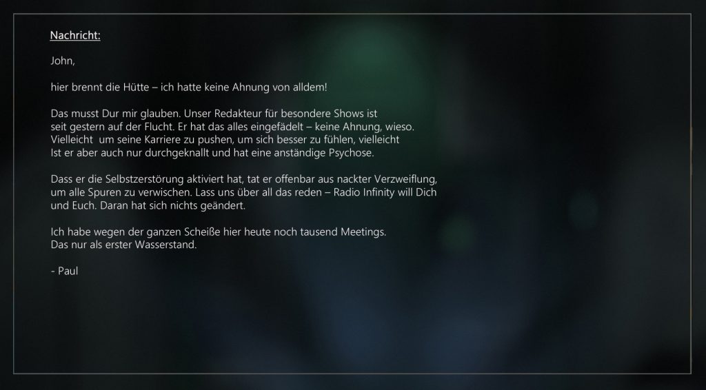 Als ich später das Band abhöre, aus dem die Redaktion von „Radio Infinity“ die neue „Crew“-Sendung zusammenschneiden wird, klinge ich wie ein Irrer. Als hätte ich komplett den Verstand verloren.
