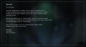 Eine weitere Nachricht von Nick: In Orison über Crusader brennt erneut der Himmel – ein weiteres Mal versuchen die Ninetails die schwebenden Plattformen einzunehmen, was wiederum dazu führt, dass auf allen Planeten des Systems der Verkehr stark limitiert wird, um aus einem lokalen Konflikt keine systemweite Katastrophe werden zu lassen.