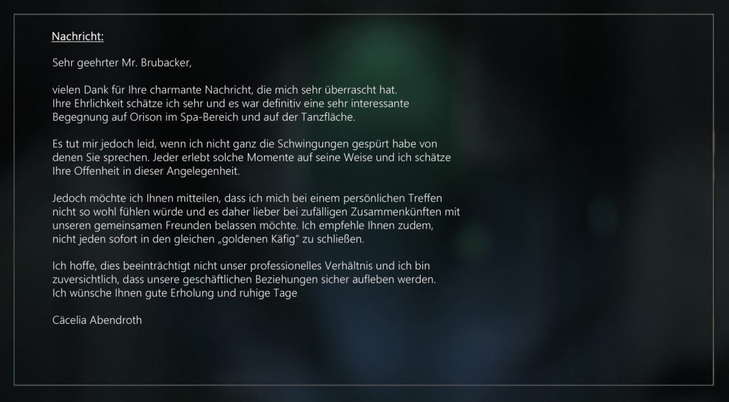 Ich blicke aus dem Fenster und sinniere – was steht in diesem Jahr alles an? Enos und die Aufklärung des Anschlages auf mein Leben. Die Free Riders. Nicks „kleines“ Drogen-Problem. Und natürlich – die Crew samt seltsamem Artefakt. Viel auf der Agenda, viele verschiedene Stränge. In der Bar erzählen die anderen beim Bier, was bei ihnen ansteht – Friedrich will seinen Scenic Cruise vorantreiben, Gate seine Catering-Firma weiter aufbauen. Nick hat dies und das auf der Uhr, sein Job bei „Radio Infinity“ nimmt ihn ganz schön unter Beschlag, höre ich raus.