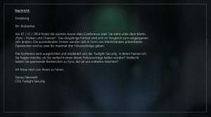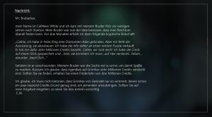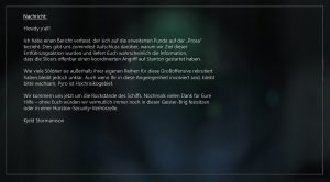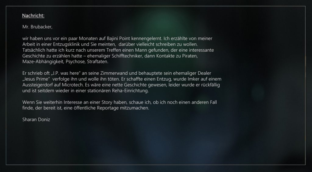 Ich erhalte Nachricht von Kjeld Stormarnson. Sie haben das Schiff untersuchen können, auch wenn dies wegen defekter Überwachungskameras alles andere als einfach war. Offenbar wurde die „Prosa“ tatsächlich geentert, die Mannschaft überfallen und aus den Luftschleusen geworfen. Das Schiff stammt vom Planeten Monox aus Pyro und wurde dort in einer improvisierten Werft für seine illegalen Einsätze umgebaut. Offenbar hatte sich Captain Hoffmann in den Dienst der „Slicers gestellt: Er sollte Unterstützungskräfte für die „Civilian Defense Force“ jagen und lahmlegen, dafür entführte Hoffmann etwa deren Führungskräfte und Söldner, darunter auch Kjeld und seine Männer. Informationen erhielt Hoffmann über die Eckhart Security, die er unterwandert hatte.