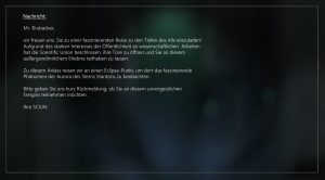 Ich wache nach unserer letzten Tour genervt und übermüdet durch das Piepen meines Mobiglases auf Port Tressler auf – eine Nachricht.