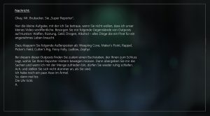 Ist vielleicht nicht schlecht, vor dem großen Experiment auf Harper’s Point zu sein. Ich ziehe mich mehr oder weniger unwillig an, dann mache ich mich auf den Weg. Kurz darauf sitze ich auch schon in Hermies Scoutingschiff, einer Terrapin, mit Ziel Harper’s Point. Wir stechen durch die Wolken, dann eröffnet sich ein wunderschönes Panorama und wir landen an einem idyllischen See. Die Sonne geht soeben unter. Hermie hat jede Menge Bier dabei – ein Frachtauftrag.