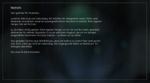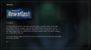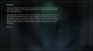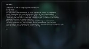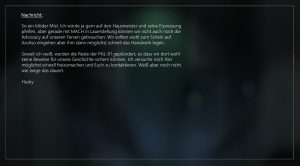 Während ich nach dem ganzen Stress auf der „Prosa“ tief und fest geschlafen habe, waren Friedrich und Zero schon wieder aktiv und haben irgendwelche Hilfsaktionen gestartet – allerdings nicht ohne Schwierigkeiten: Friedrich setzt die „Nordlicht Eins“ für karitative Lieferungen ein, hat aber wohl Probleme bei den Abfertigungen; auch Zero hilft den „Citizens of Prosperity“. Ihm haben sie sogar ein Schiff gestellt. Ich reibe mir die Schulter und lese das Nachrichtenprotokoll. Wenn sich Friedrich erstmal in etwas festgebissen hat, lassen ihm die Dinge keine Ruhe mehr. Und Zero ist ja ohnehin immer für die kleinen Leute da.
