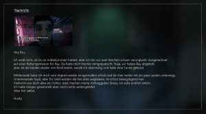 Viel gibt es nicht zu entdecken und wir wollen den heutigen Streckenabschnitt schon beenden, als Husky doch noch über etwas Interessantes stolpert: ein Audiolog. Dieses berichtet davon, dass die zweiköpfige Besatzung – offenbar eine Frau und Mann – in Planetennähe in schweres Wetter geriet und ihr Schiff dann abgestürzt ist. Leider ist die Aufnahme nur schwer zu verstehen. Doch Husky vermutet, dass noch mehr dahinter stecken könnte. An Bord der „Frost“ will er das Log daher noch einmal mit besseren Methoden analysieren.