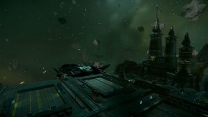 Der Pyro-Sprungpunkt ist nicht weit von ArcCorp entfernt und bald sehen wir auch schon den Nebel der die Raumanomalie umgibt. Wir nähern uns vorsichtig der riesigen Raumstation, erhalten die Landeerlaubnis und nach der Landung gebe ich die „Shack One“ zur Reparatur frei.