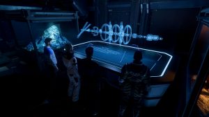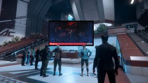 Die Menschen stehen dicht beisammen, schauen auf Monitore oder Hologramme.