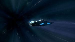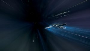 Ich drücke den Schubhebel der „Shack One“ langsam nach vorn, konzentriere mich auf das große schwarze Loch im Nichts vor uns, richte das Schiff aus, dann löst sich der Weltraum plötzlich in Schwaden auf und wir fallen in eine Art Tunnel.