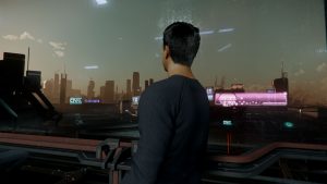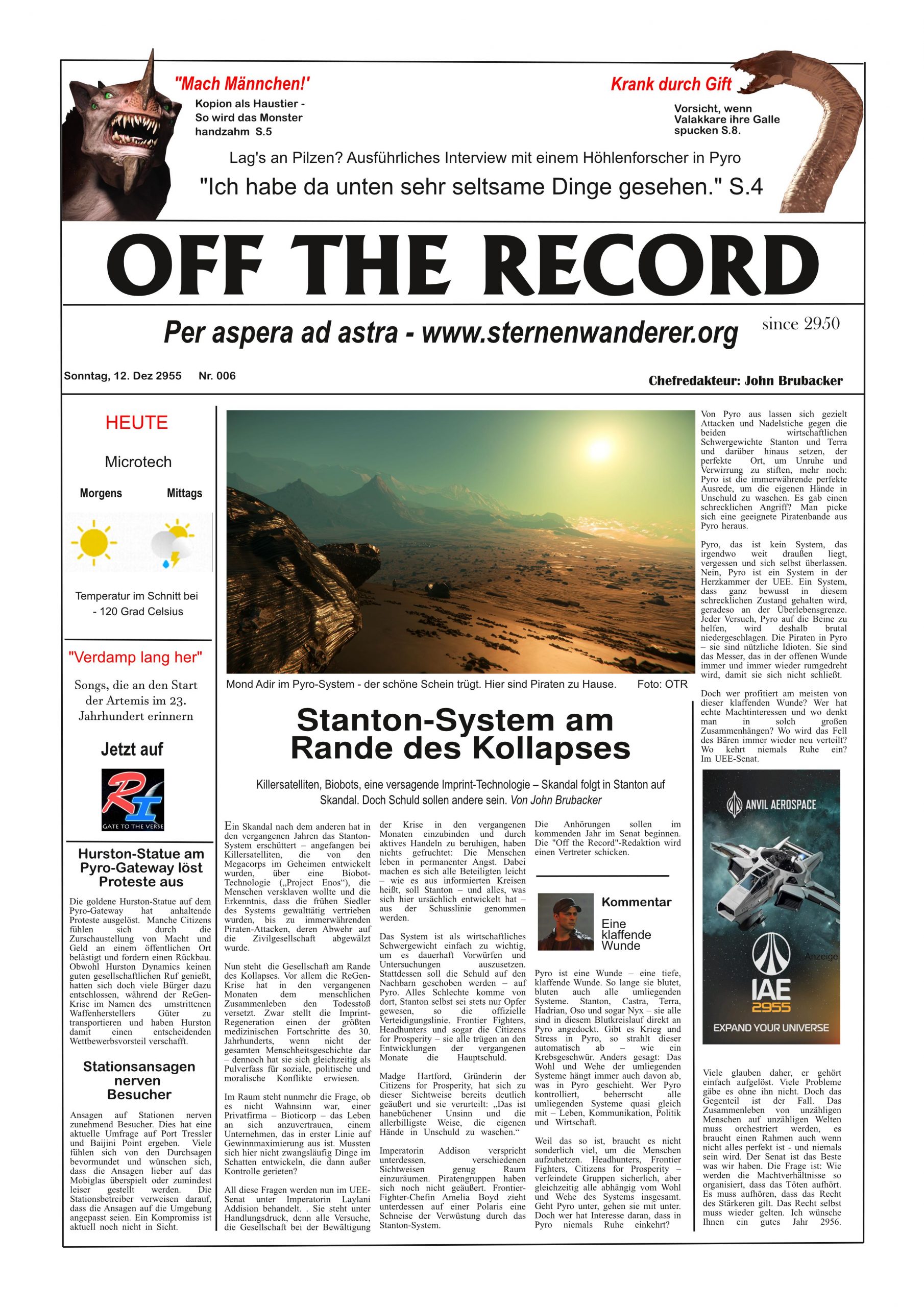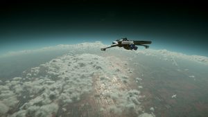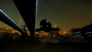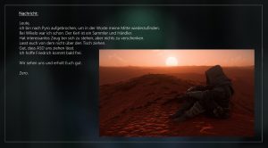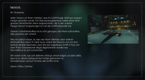 Ich checke, ob der Chip mit den Daten aus dem Distributionscenter  in meinem Anzug steckt, dann mache ich mich auf den Weg zum Riker Spaceport. Bevor es nach Pyro geht, will ich wenigstens einmal die Turbinen der „Shack One“ testen. Nie hätte ich in diesem Moment gedacht, dass ich für sehr lange Zeit nicht mehr in die Redaktion zurückkehren würde.