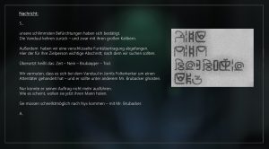 „Mr. Brubacker, viel Glück. Seien Sie vorsichtig. Trauen Sie niemandem. S.“